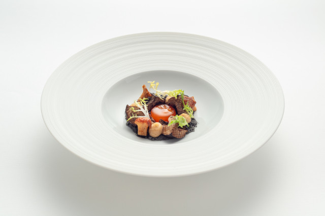 - Uzené grilované houby, sherry ocet, lesní byliny, vaječný žloutek, jedlá zem