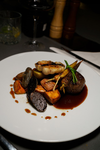 • Steak z pravé svíčkově s bylinkovými grenaillemi a glazovanou šalotkou