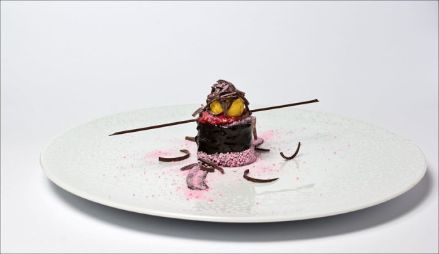 Perník s emulzí z kefíru a pomerančového oleje, espuma z kumquatu, pomerančové želé, javorový tuile a kandovaný kumquat ve whiskey